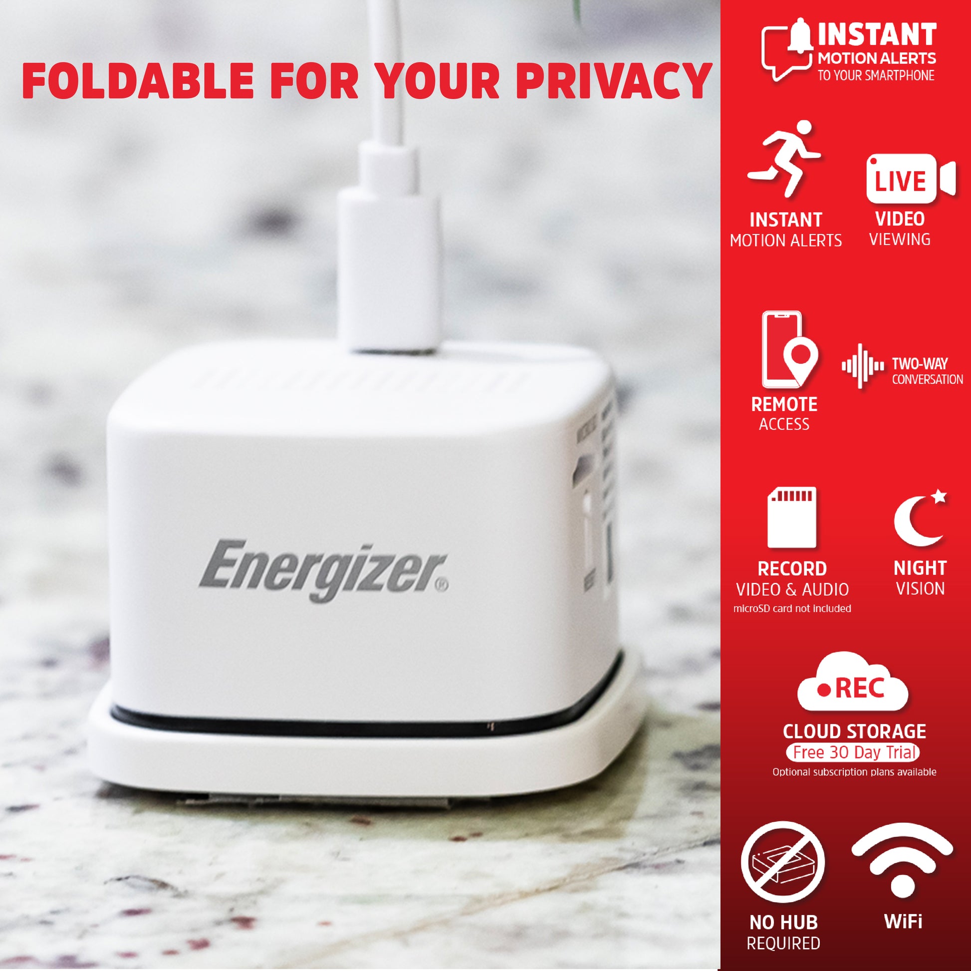 Secure your home on your terms with the Energizer® Connect Smart Wi-Fi Foldable Privacy Indoor Camera: