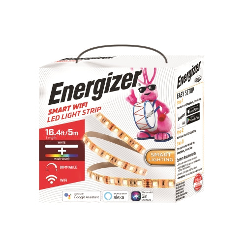 Ever wanted to transform the way you light a particular space? Interested in creating striking colors that redefine areas? With the Energizer 16.4-foot Smart Wi-Fi LED Light Strip, you can accomplish those very goals. Featuring multiple multi-color options, and a single White shade, you can craft custom lighting that best reflects your location or mood. Behind a device monitor, a spot in your kitchen/living room, or even adding a little extra light to your bedroom or office, all are possible. You can even control your strip from anywhere with the Energizer Connect App. Turn your lights on and off whenever you want or make custom changes to your color scheme. You'll also be able to group multiple light strips together or create specific schedules that reflect your daily routine or needs. Our strips also work with Amazon Alexa, Google Assistant and Siri for full voice control functionality over your lights. Connect directly to your home's Wi-Fi with no complicated setups, hubs, or ridiculous add-ons. Add a little more light and color to your space with the 16.4-foot Smart Wi-Fi LED Light Strip.